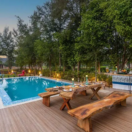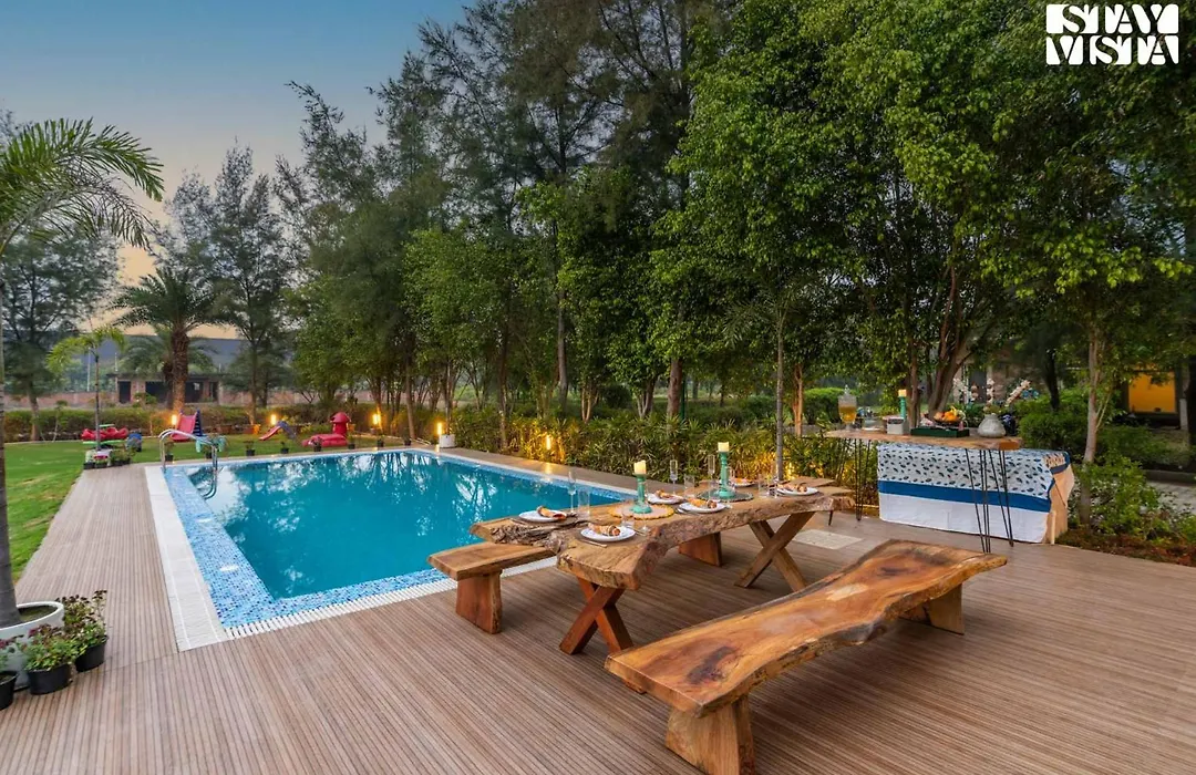 StayVista at Barton Estate with Outdoor Pool - Pataudi グルガウンは,リラックスできるプライベ-トなプ-ルを備えています. 施設はベッドル-ムの3室,バスル-ムの3室を有しています.